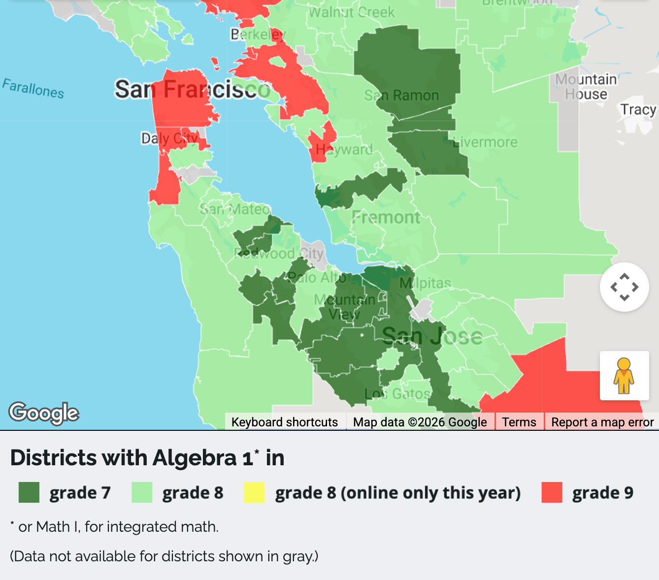 As of November 2025, roughly half of San Francisco’s middle and K–8 schools were still not offering on-site algebra. And as the San Francisco Standard reported, at places like Denman Middle School, opposition to middle school algebra can still come from ideologically motivated school officials and principals standing athwart the motivated students and dedicated teachers begging their admin to let them learn and teach algebra. The district’s spokesperson, per the Standard article, also refused to answer questions about whether on-site algebra will be available at all schools this coming year.