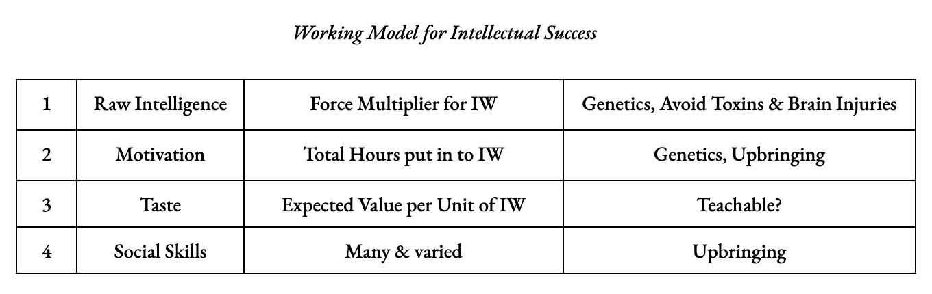 And there’s an obvious mathematization of this. Raw intelligence — or some part of it, depending on the task, whether working memory, the ability to make connections, or otherwise — is a force multiplier for the hours of intellectual work that one puts into a subject. Then motivation or obsessiveness determines how many of those hours one put in. And then the operationalization of taste is the expected value per unit of intellectual work of the projects that you choose to work on. For a formula, we can multiply these three together: