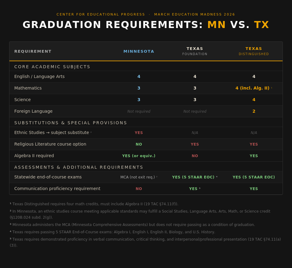 Across these criteria, then, Texas pulls ahead of Minnesota, primarily on the strength of its math instruction pipeline, its exam requirements, and the different diploma tracks.
