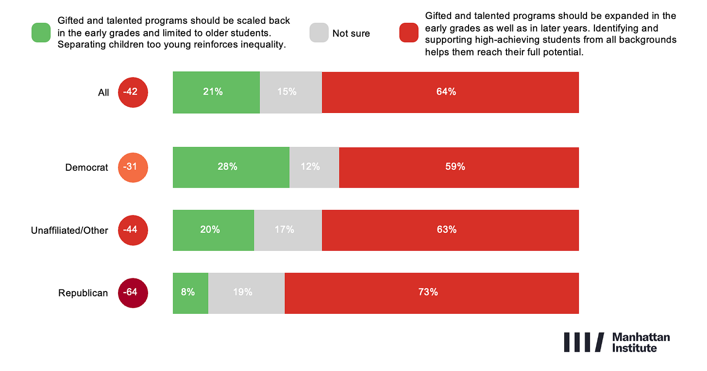 A new report from Welcome, the Democratic-aligned PAC, is dominating conversations on X this week. Titled “Deciding to Win”, it offers a roadmap for Democrats to rebound from 2024 by shedding unpopular progressive positions. Education isn’t the centerpiece, but one detail jumped out to advanced learning advocates (like me): Voters strongly oppose eliminating tracking (ability-grouping) in public schools, ranking it among the most toxic policies associated with Democrats.