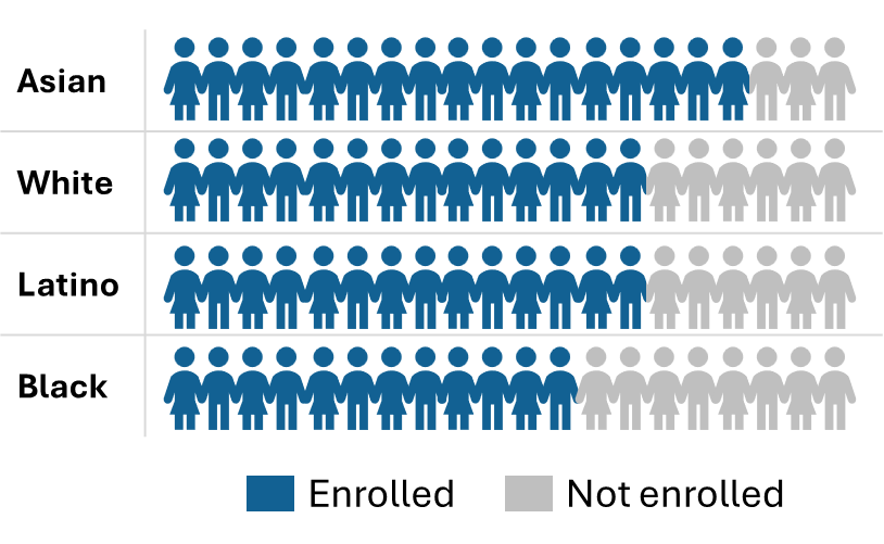 In schools that do offer Algebra courses, enrollment isn’t equitable. More than half of Asian students enrolled when the course was available, compared to just 22% of Latino students and 17% of black students. These gaps show that availability alone doesn’t guarantee access where appropriate. For many students, especially black and Latino ones, the barrier is not whether their school offers Algebra, but whether they are given the chance to take it.