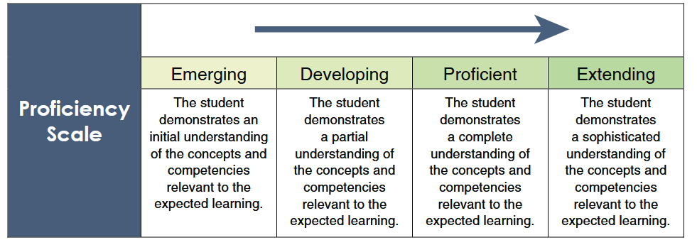 Under the “K–12 Student Reporting Policy,” while letter grades and percentages are still used in Grades 10–12, in Grades K–9 teachers are required to assess student learning using a four-point “Provincial Proficiency Scale": "Emerging," "Developing," "Proficient," or "Extending."