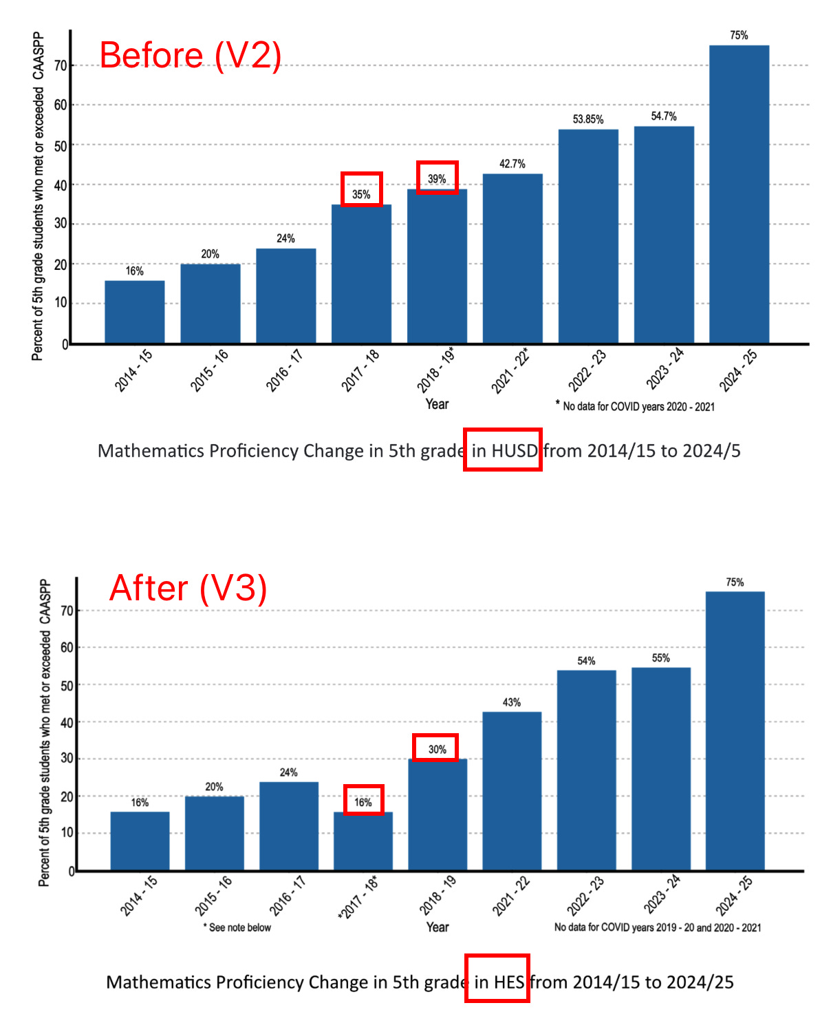 In the revised version, the chart no longer shows district-wide data. It now shows data for a single school: Healdsburg Elementary School (HES). The revised version does not mention this significant change, one that significantly affects what the data mean.