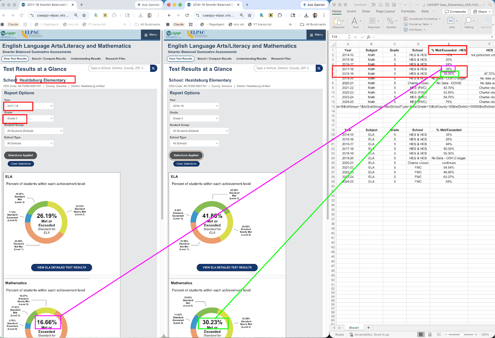 She told me that, although the chart was labeled HUSD, it in fact showed data from one specific school: Healdsburg Elementary School (HES). She shared the spreadsheet in which she had assembled the data. Unfortunately, the discrepancy wasn’t just a labeling problem. Even the HES data didn’t match the spreadsheet: